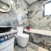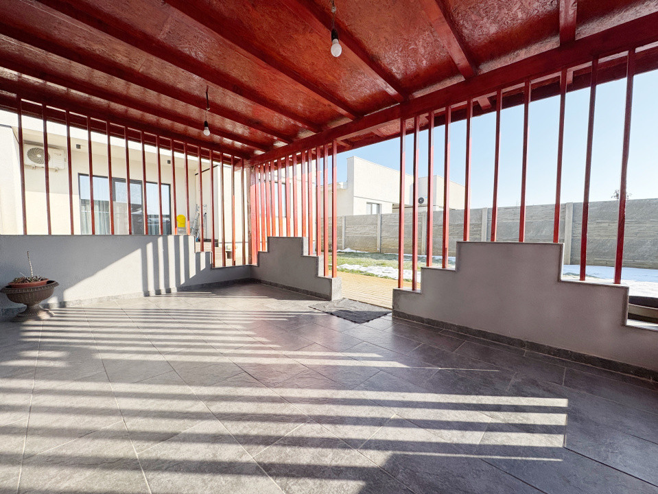 Casa este alcatuita din living cu iesire pe terasa, bucatarie, baie si 2 dormitoare dintrecare unul cu baie proprie .